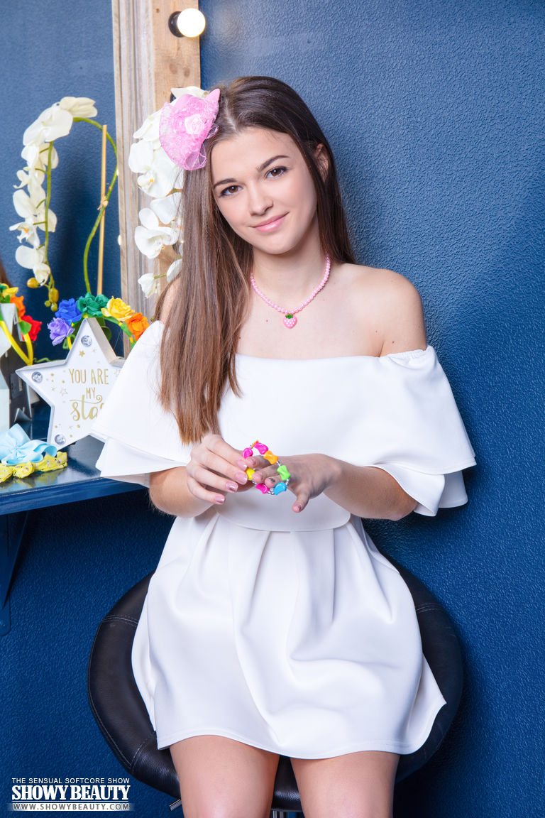 Breathtaking girl in white gets her clothes off and starts posing naked for you and for the camera.