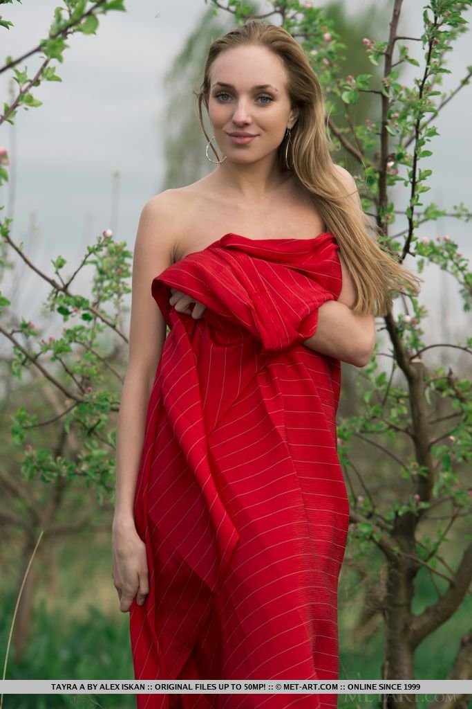 Tayra a playfully posing with a bright red fabric wrapped around her delicate, naked body