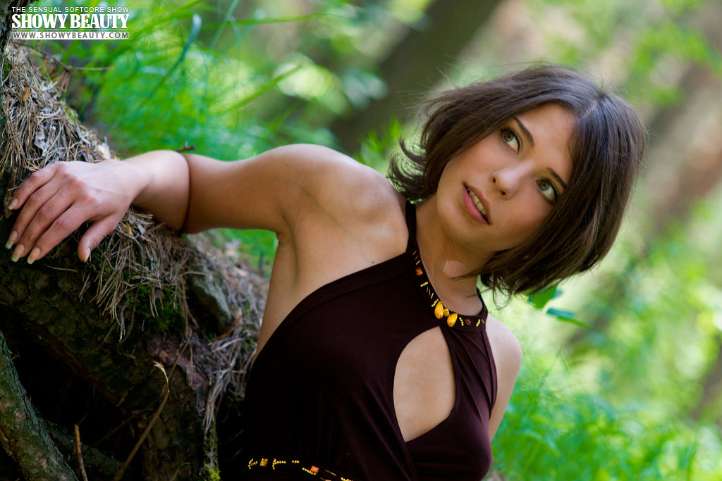 Hot girl takes off her dress while walking in the woods and shows off her tits and pussy.