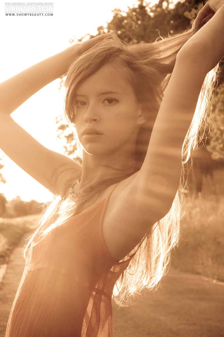 Gorgeous slim model sexually strips and poses on a road letting you admire her sweet pussy.