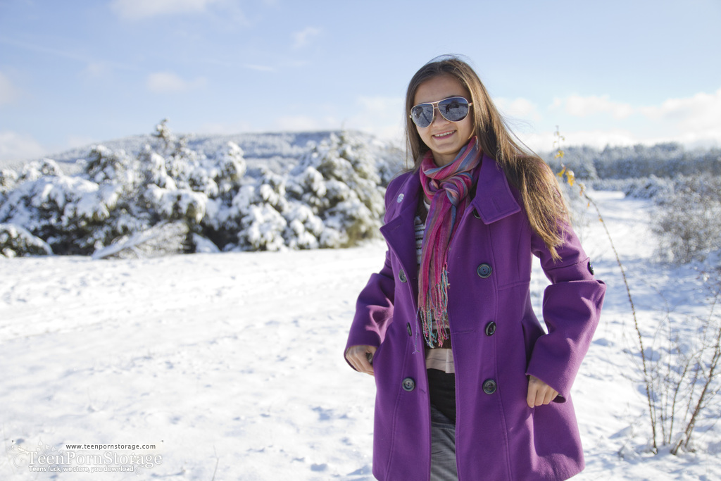 Gorgeous long haired teen sweetie demonstrating her hairy cunt outdoors on the cold snow.